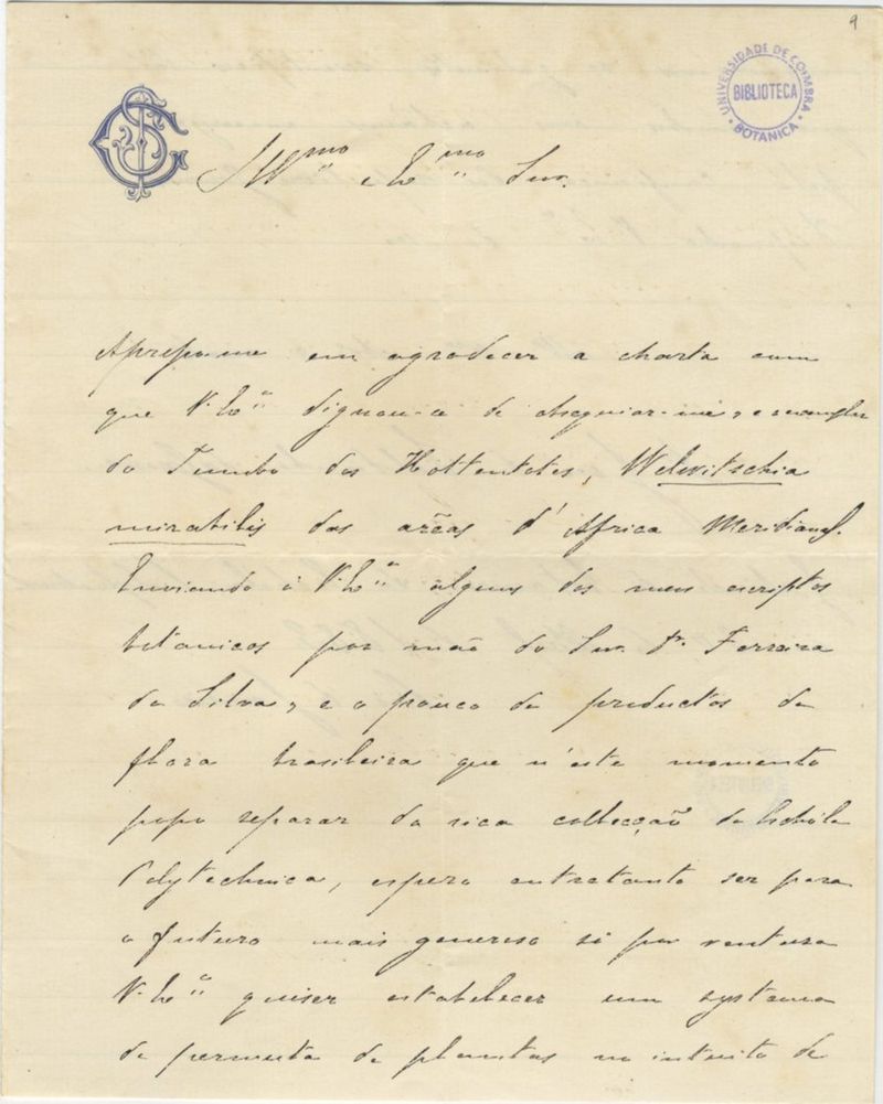 [Carta], 1883 Abr. 30, Rio de Janeiro, [a Júlio Henriques, Coimbra] José de Saldanha da Gama