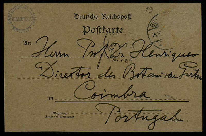 Poftkarte, 1905 Oct. 16, Berlin, [an] Herrn Prof. Dr. [Júlio] Henriques, Coimbra