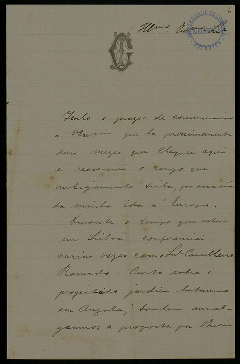 [Carta], 1902 Maio 20, Loanda, [a] Professor Dr. Júlio Henriques, Coimbra