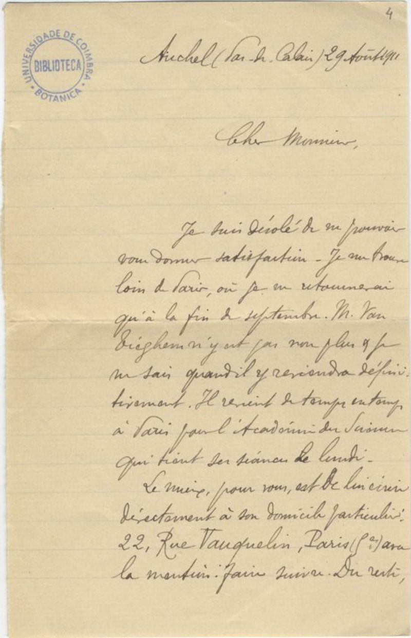 [Lettre], 1911 août 29, Auchel, [à Júlio Henriques, Coimbra]