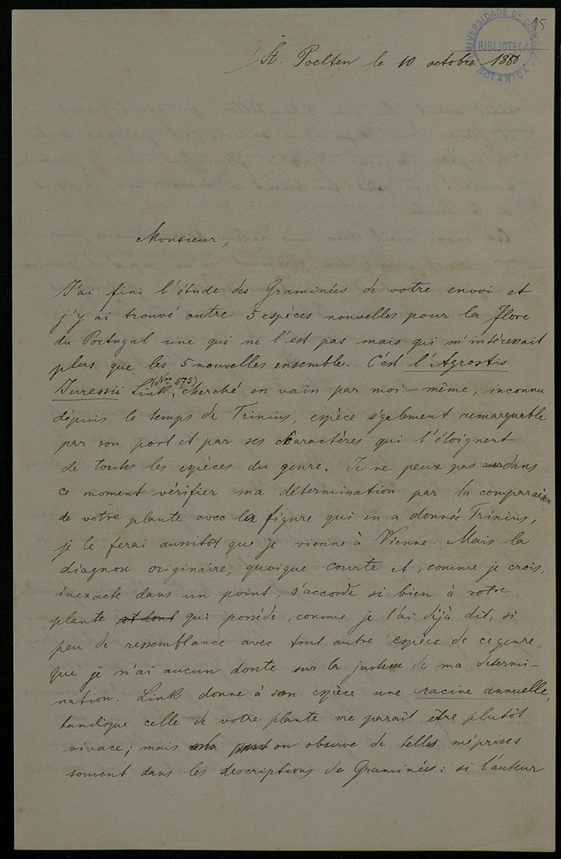[Lettre], 1880 oct. 10, St. Poelten, [à] Monsieur [Júlio Henriques], Coimbra