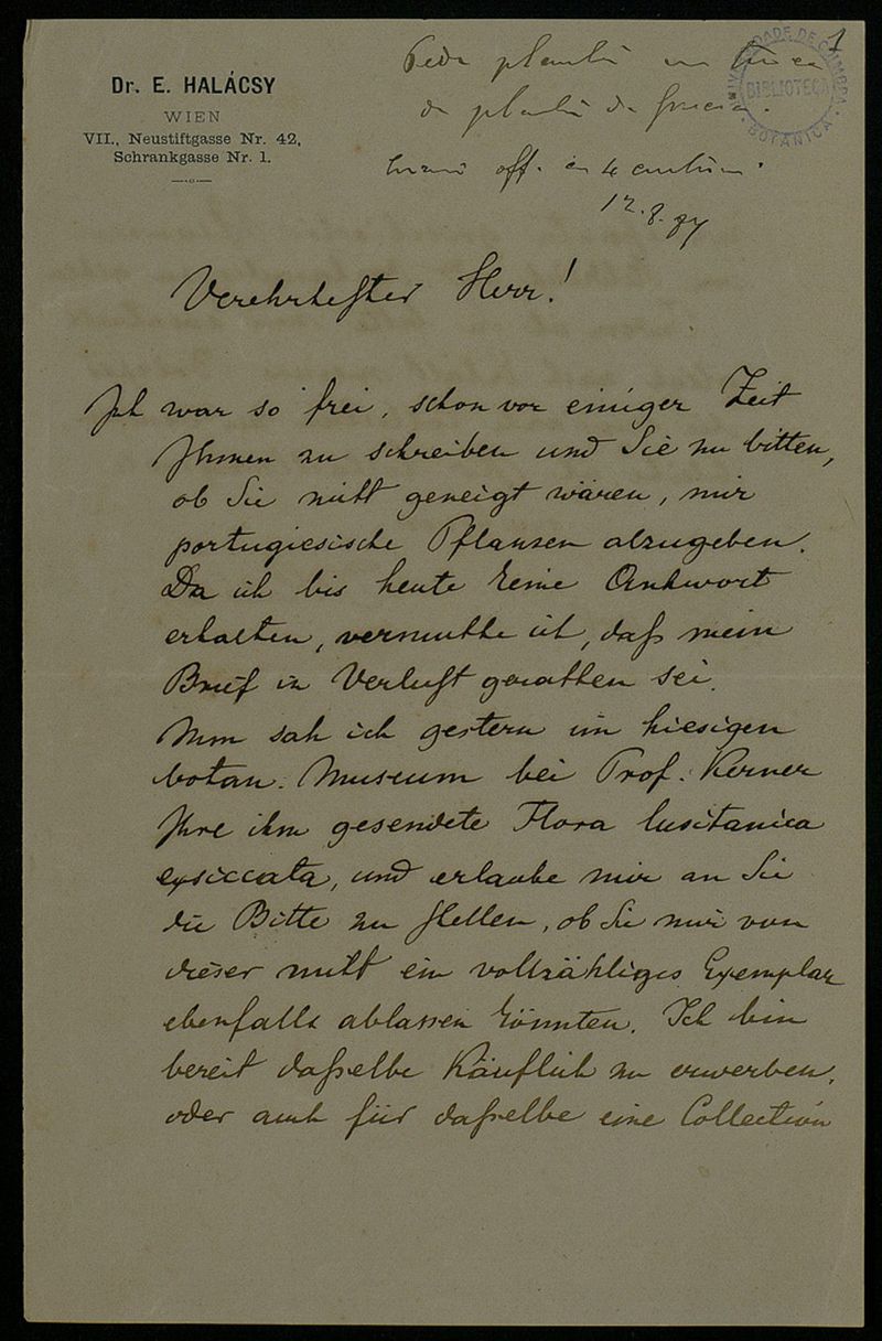 Halácsy, Eugen von, 1842-1913 (correspondente)