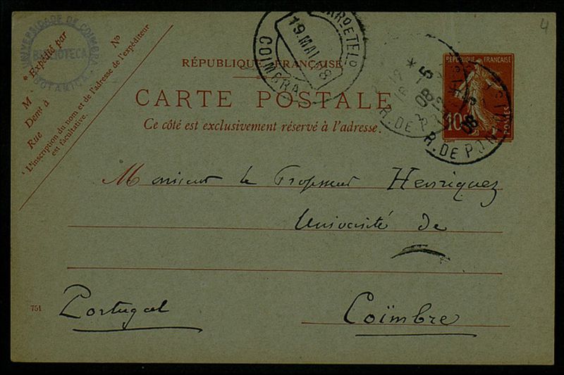 Carte postale, 1908 mai 15, Paris, [à] Monsieur le Professeur [Júlio] Henriquez, Coimbra