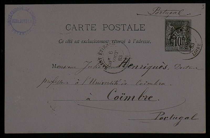 Carte postale, 1883 août 6, St. Etienne, [à] Monsieur Julio Henriques, Coimbra