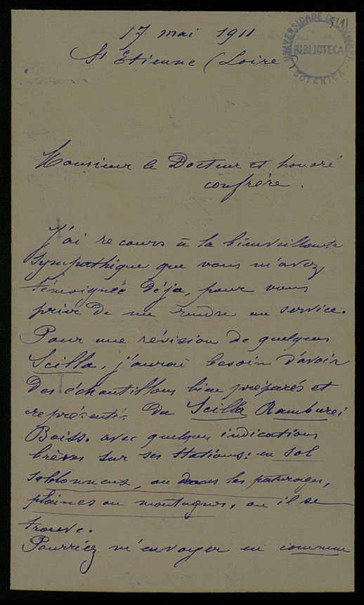[Lettre], 1911 mai 17, St. Etienne, [à] Monsieur [Júlio Henriques], Coimbra