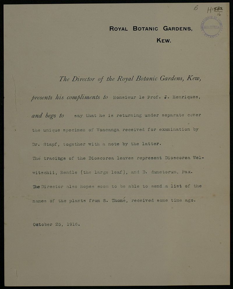 [Letter], 1916 Oct. 25, Kew, [to] Monsieur le Prof. J. Henriques, Coimbra