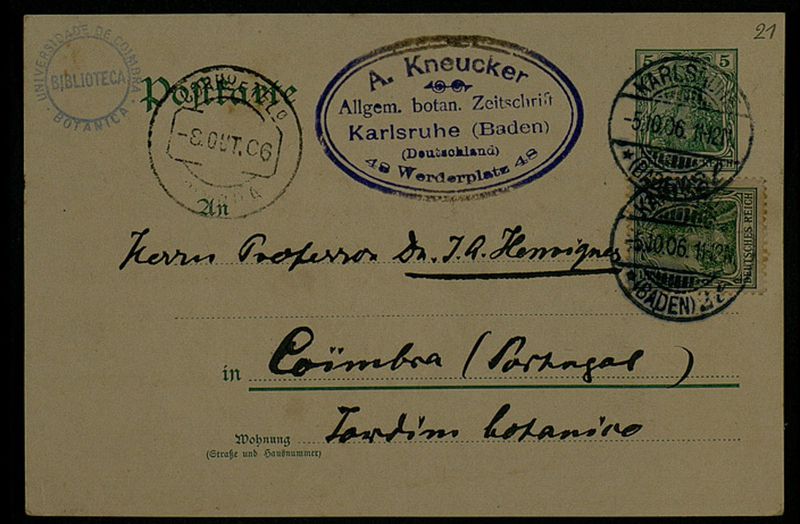 Postkarte, 1906 Okt. 5, Karlsruhe, an Herrn Professor Dr. J. A. Henriques, Coimbra