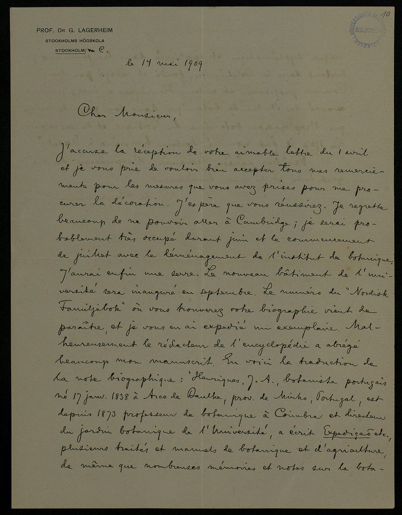 [Lettre], 1909 mai 14, Stockholm, [à ] Monsieur [Júlio Henriiques], Coimbra