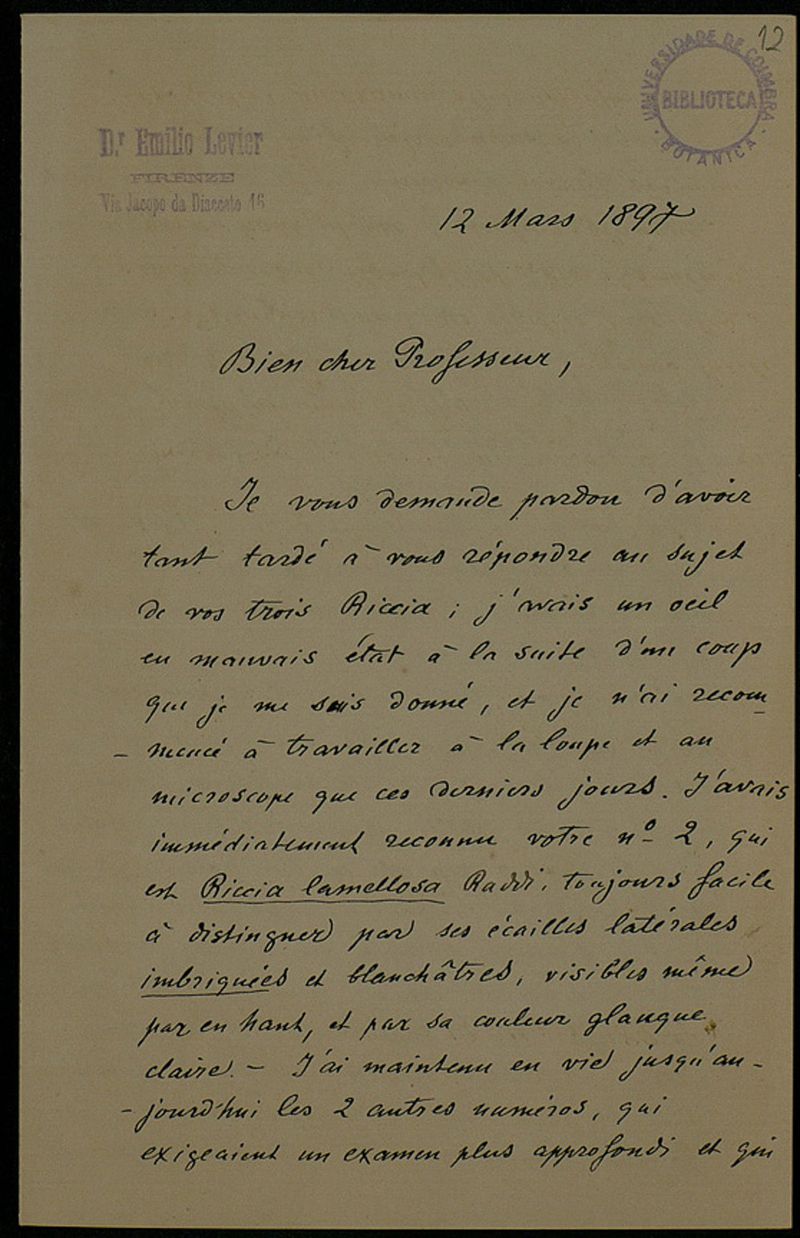 [Lettre], 1897 mars 12, Firenze, à Professeur [Júlio Henriques, Coimbra]