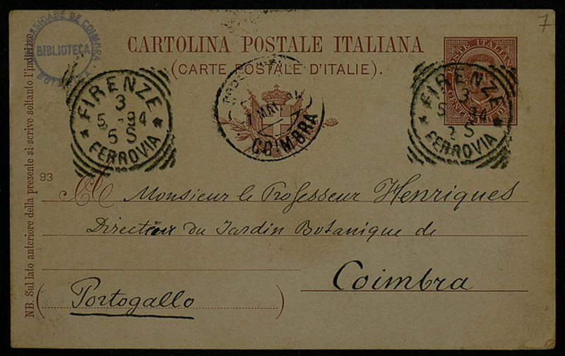 Cartolina Postale Italiana, 1894 mai 2, Florence, à Monsieur le Professeur [Júlio] Henriques, Coimbra