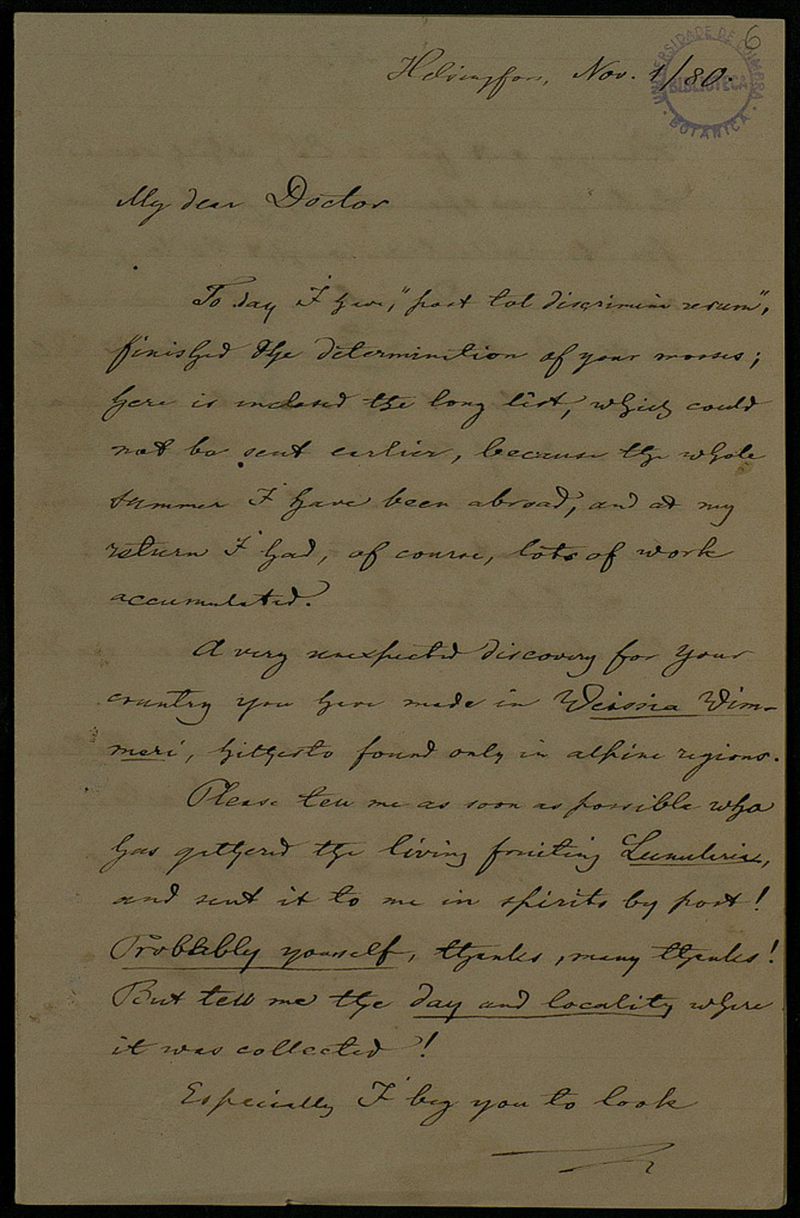 [Letter], 1880 Nov. 1, Helsingfors, [to] Doctor [Júlio Henriques, Coimbra]
