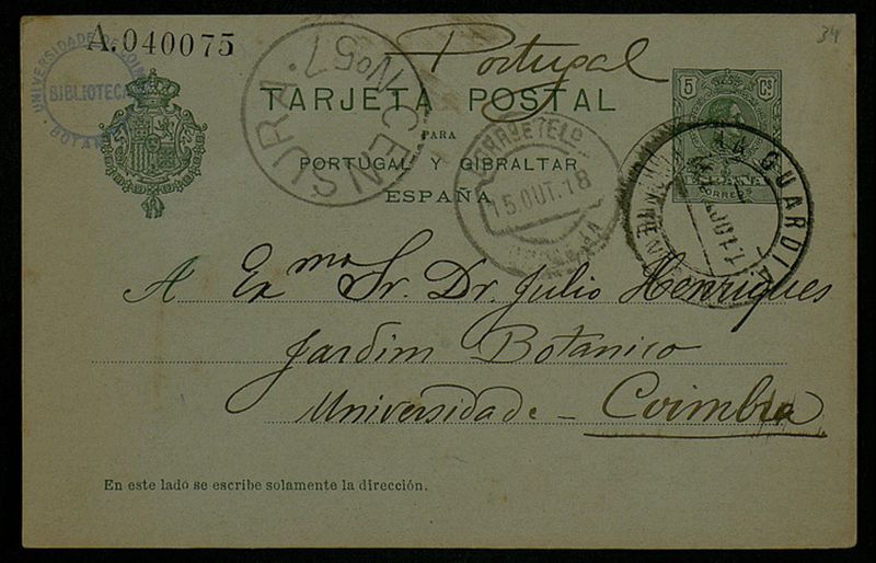 Tarjeta Postal, 1918 Ago. 14, La Guardia, a Dr. Júlio A. Henriques, Coimbra