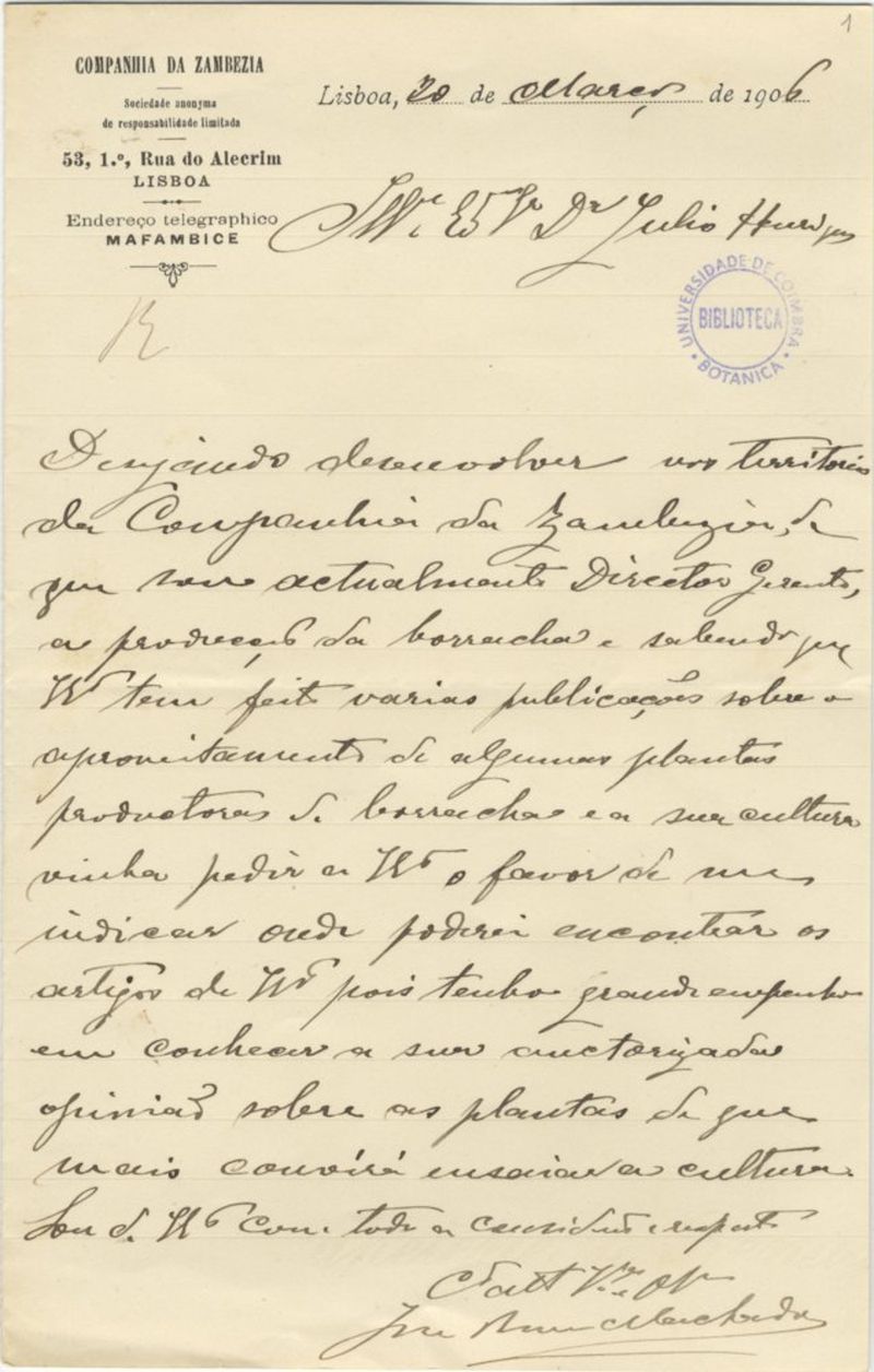 [Carta], 1906 Mar. 20, Lisboa, [a] Julio Henriques, [Coimbra]