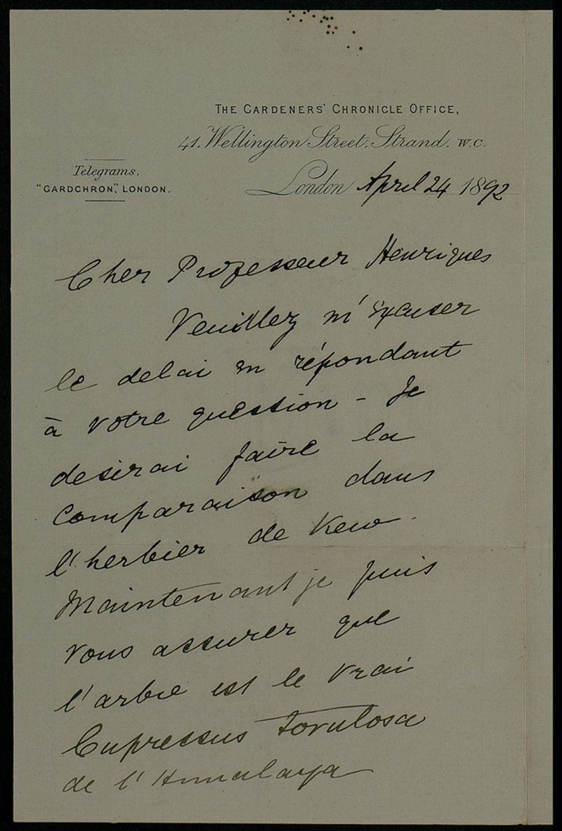 [Lettre], 1892 Apr. 24, London, [to] Professeur [Júlio] Henriques, [Coimbra]