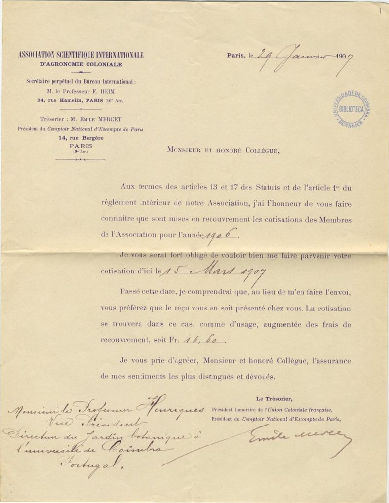 [Lettre], 1907 jan. 29, Paris, [à Júlio] Henriques, [Coimbra]
