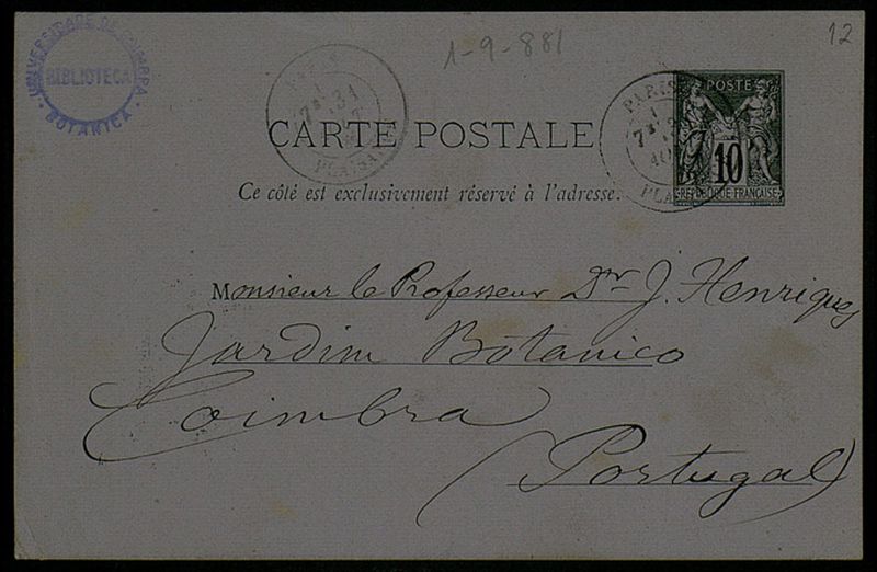 Carte postale, 1881 sept. 1, Paris, [à] Monsieur le Professeur Dr. J. Henriques, Coimbra