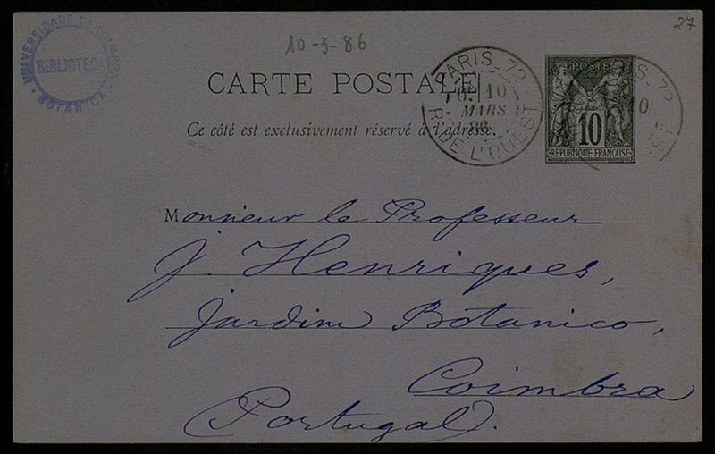 Carte postale, 1886 mars 10, Paris, [à] Monsieur le Professeur J. Henriques, Coimbra