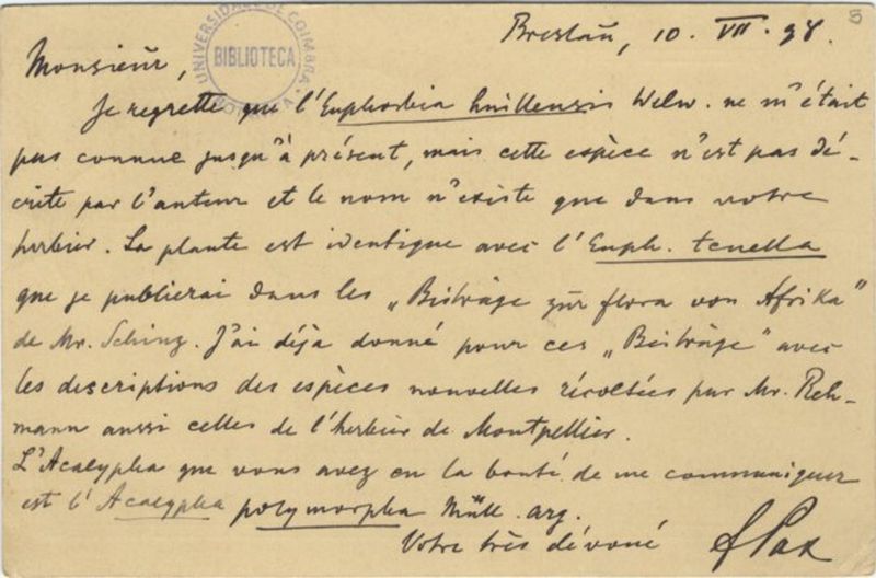 Pax, Ferdinand Albin, 1858-1942 (correspondente)