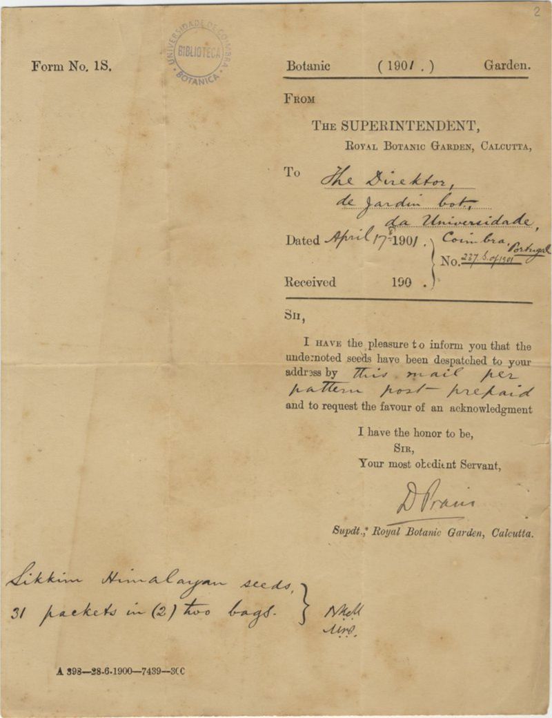 Formulário impresso de "Royal Botanic Garden - Calcutta".