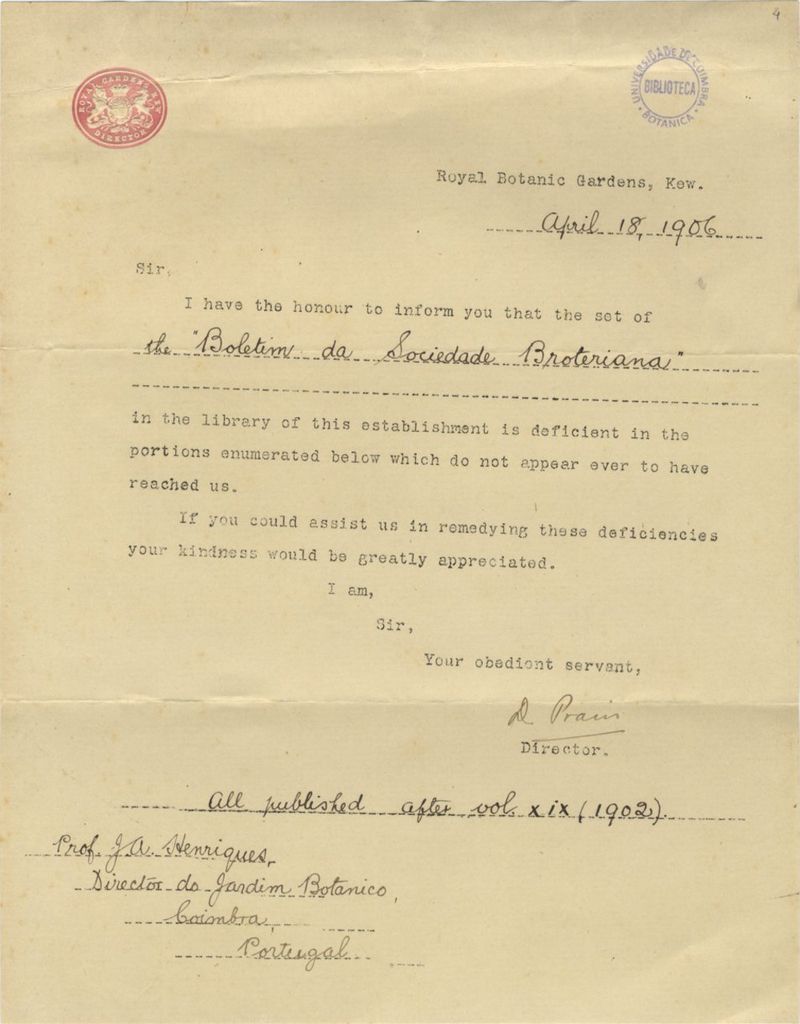 [Letter], 1906 Apr. 18, Kew, [to] J[úlio] A[ugusto] Henriques, Coimbra