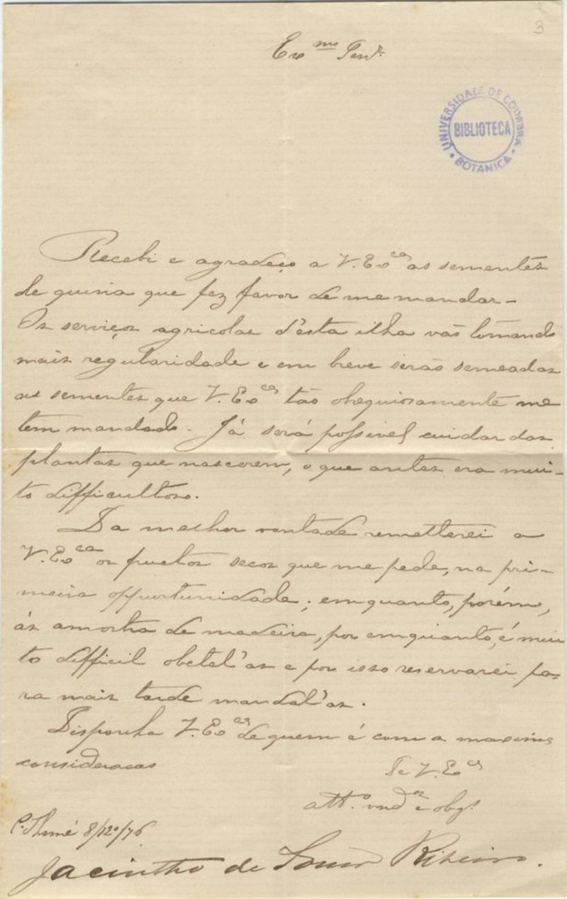 [Carta], 1876 Dez. 08, S. Thomé, [a Júlio Henriques, Coimbra] Jacintho de Sousa Ribeiro