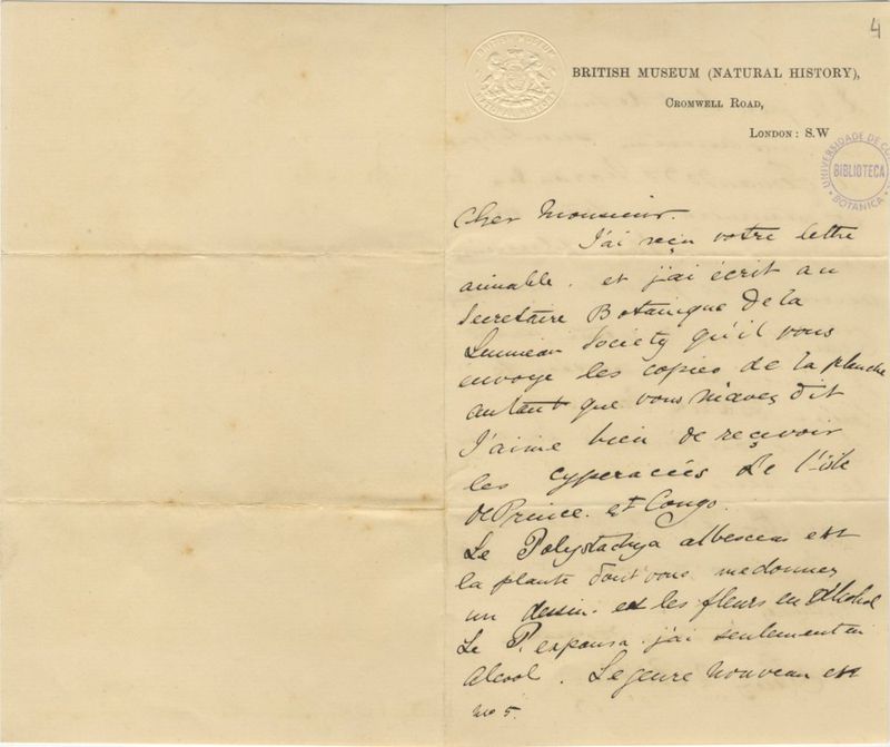 Em papel impresso com timbre e ex-libris de "British Museum - Natural History".