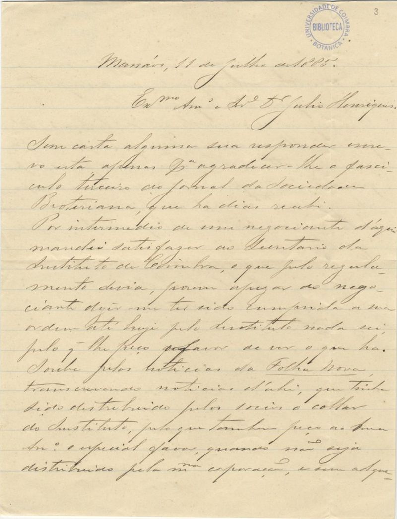 [Carta], 1885 Jul. 11, Manáos, [a] Julio Henriques, [Coimbra] J. Barbosa Roiz [sic]