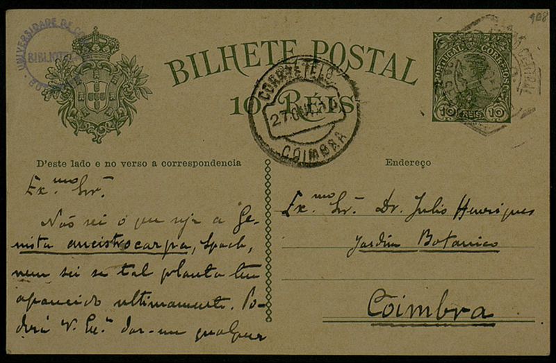 Bilhete Postal, 1910 Out. 24, Porto, a Dr. Júlio Henriques, Coimbra