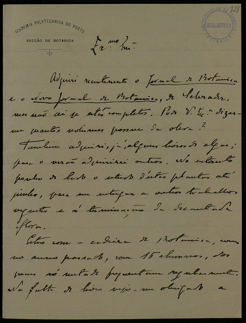Papel timbrado de: Academia Polythechnica do Porto - Secção de Botanica.