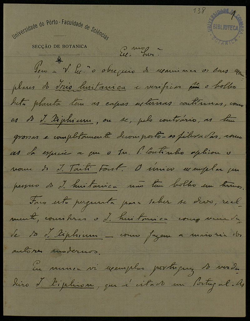 Papel timbrado de: Universidade do Pôrto - Faculdade de Sciências - Secção de Botanica.