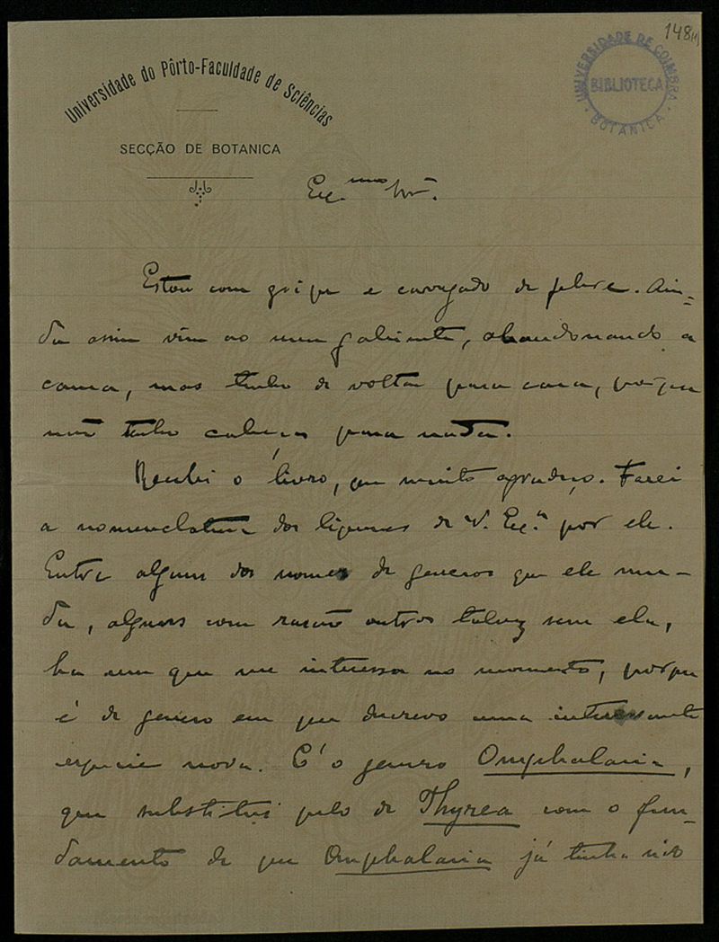 Papel timbrado de: Universidade do Pôrto - Faculdade de Sciências - Secção de Botanica.