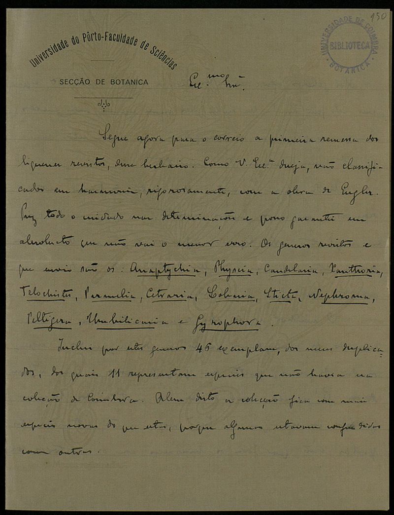 Papel timbrado de: Universidade do Pôrto - Faculdade de Sciências - Secção de Botanica.