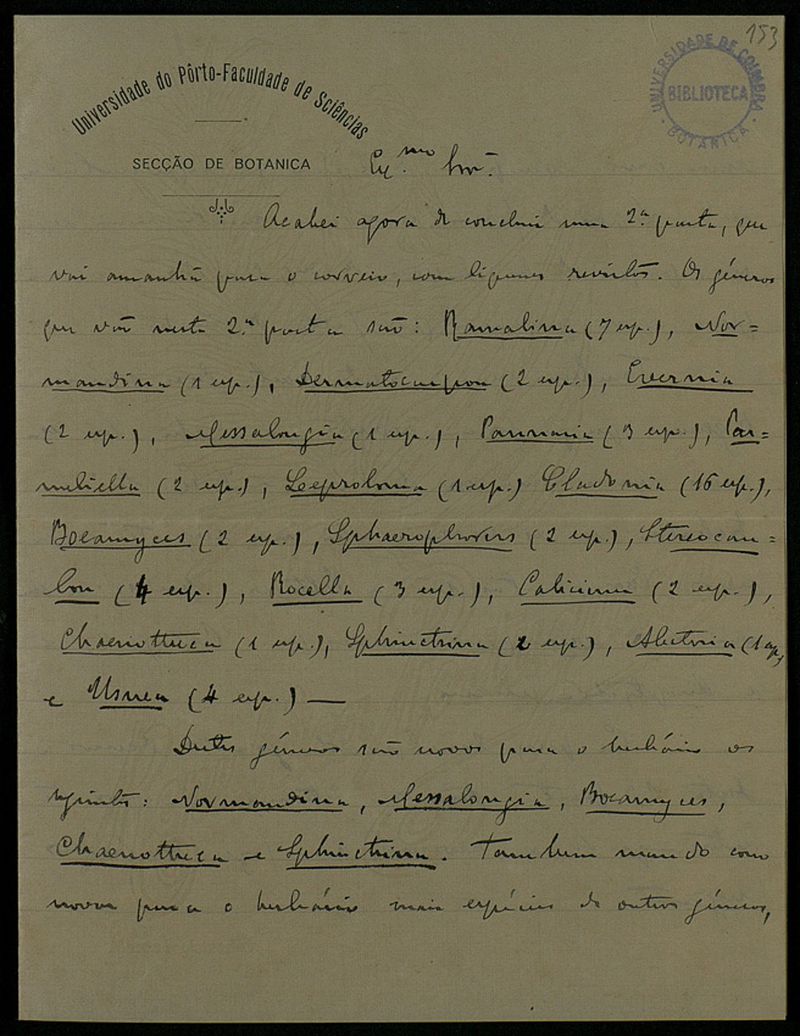 Papel timbrado de: Universidade do Pôrto - Faculdade de Sciências - Secção de Botanica.