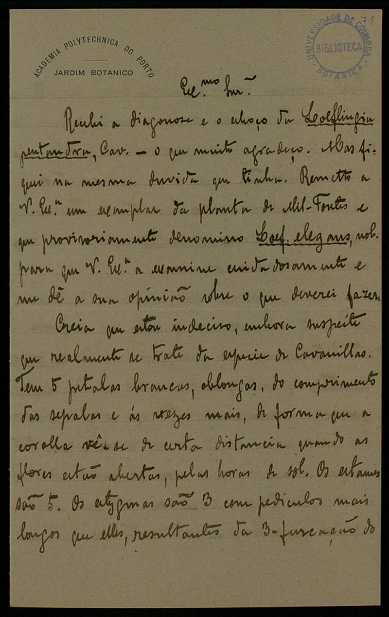Papel timbrado de: Academia Polythechnica do Porto - Jardim Botanico.