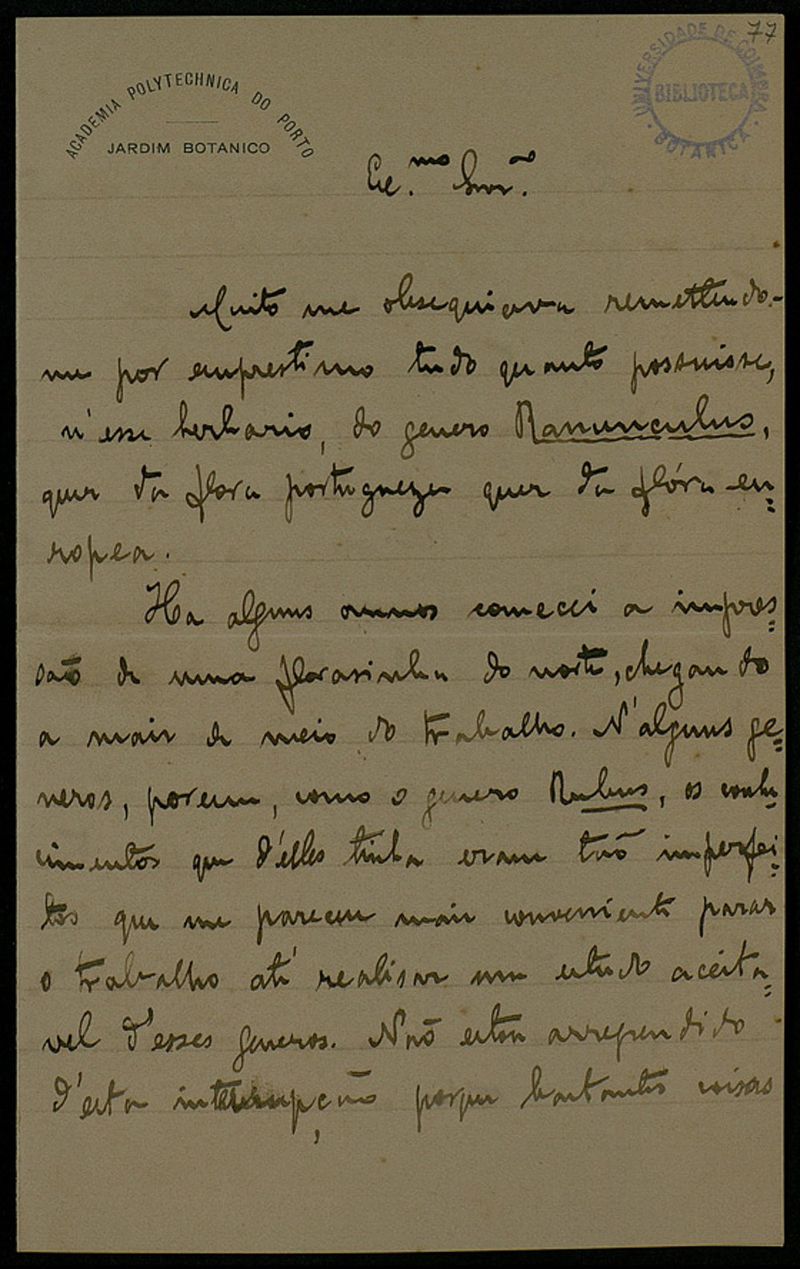 Papel timbrado de: Academia Polythechnica do Porto - Jardim Botanico.