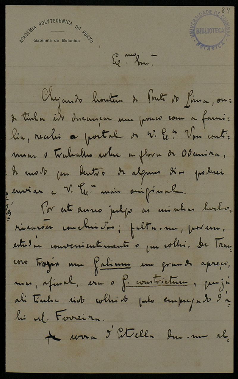 Papel timbrado de: Academia Polythechnica do Porto - Gabinete de Botanica.