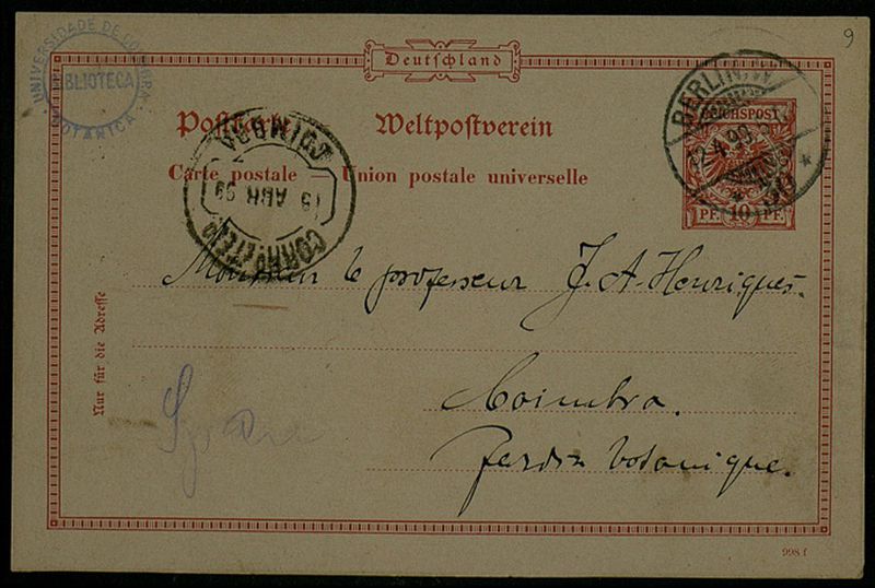 Postkarte welpostverein, 1899 avr. 13, Berlin, [à] Monsieur le professeur J. A. Henriques, Coimbra
