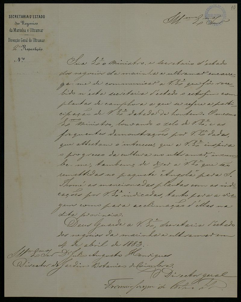 [Carta], 1883 Abr. 4, Lisboa, [a] Dr. Julio Augusto Henriques, Coimbra