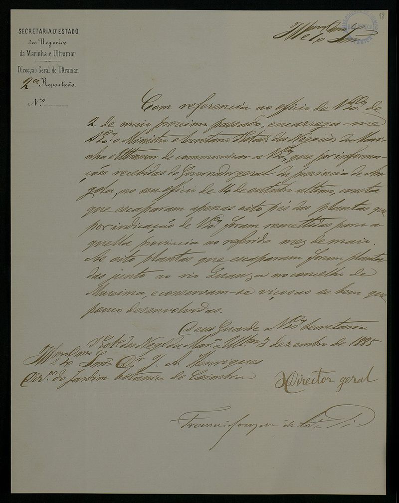 Papel timbrado de: Secretaria d' Estado dos Negocios da Marinha e Ultramar - Direcção Geral do Ultramar.