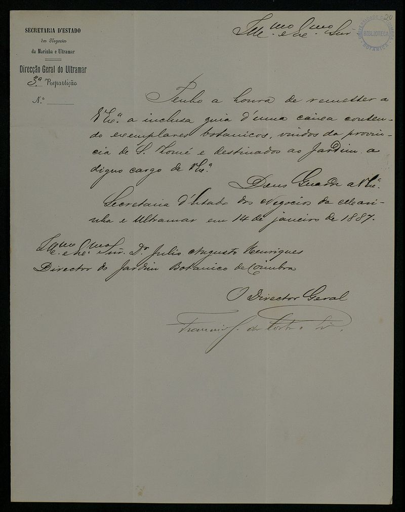 [Carta], 1887 Jan. 14, Lisboa, [a] Dr. Julio Augusto Henriques, Coimbra