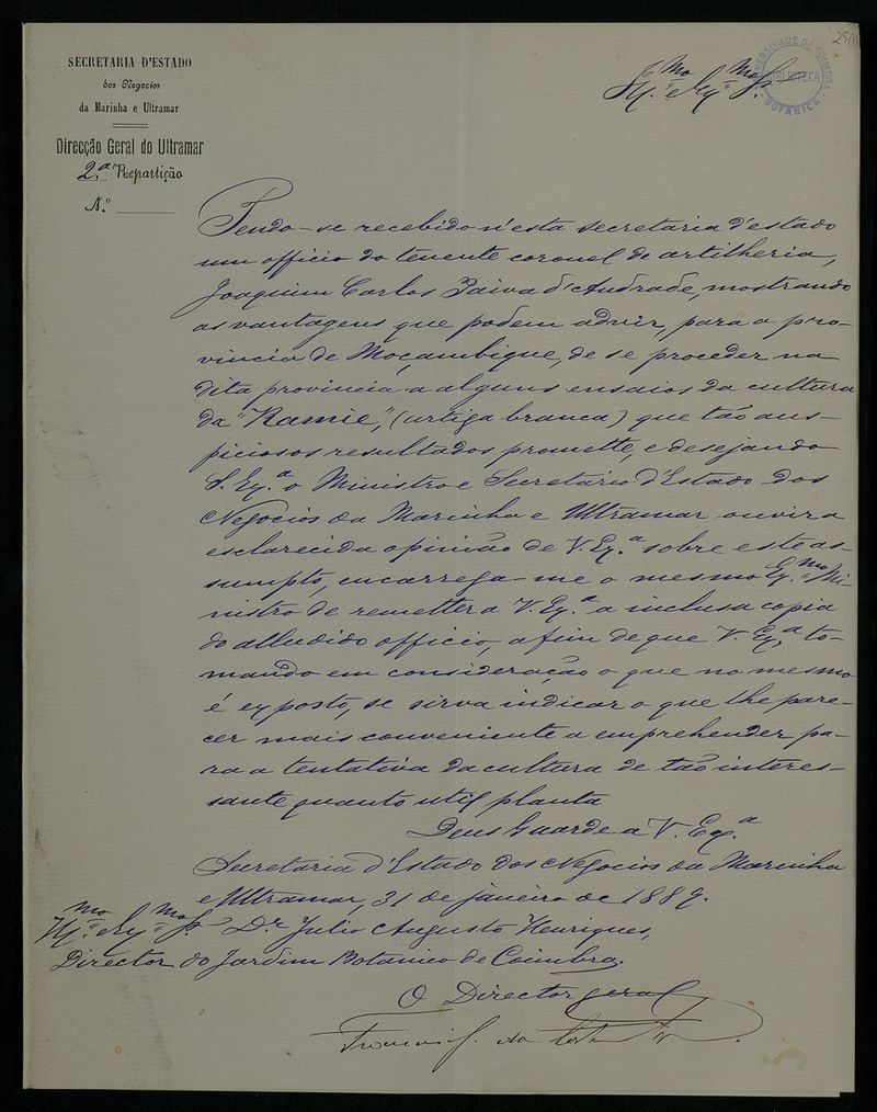 Acompanhado de uma cópia autenticada de oficio do Tenente Coronel Joaquim Carlos Paiva d' Andrade, relativa à cultura da urtiga branca na província de Moçambique.