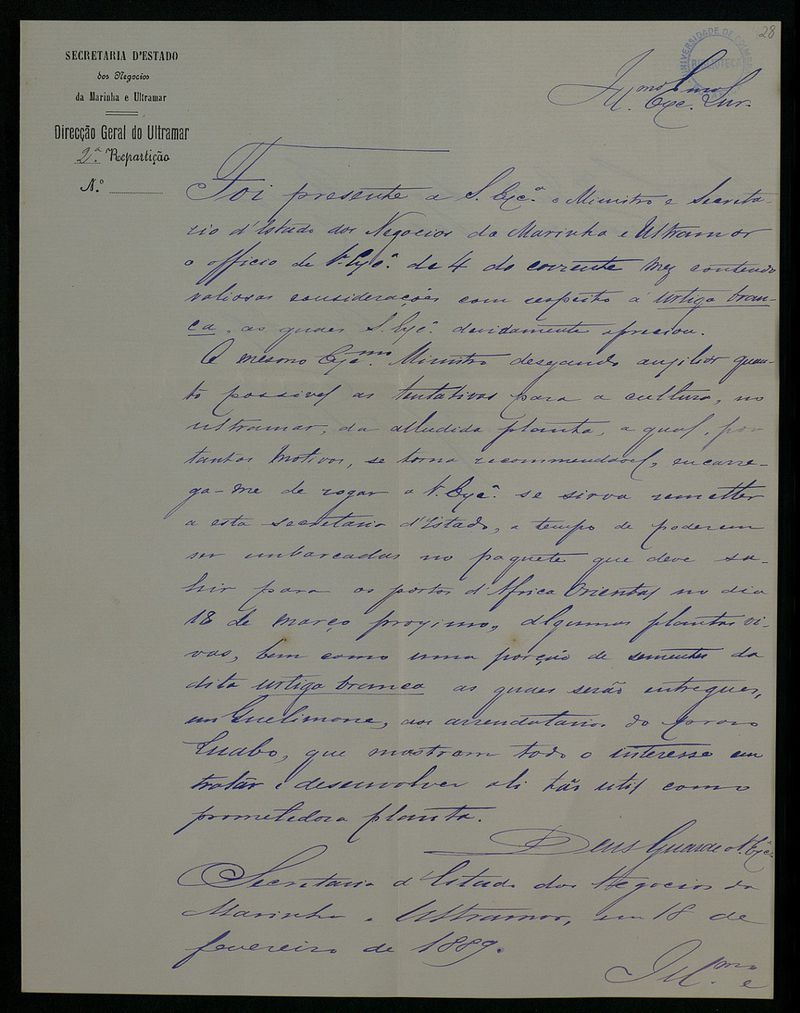 Papel timbrado de: Secretaria d' Estado dos Negocios da Marinha e Ultramar - Direcção Geral do Ultramar.