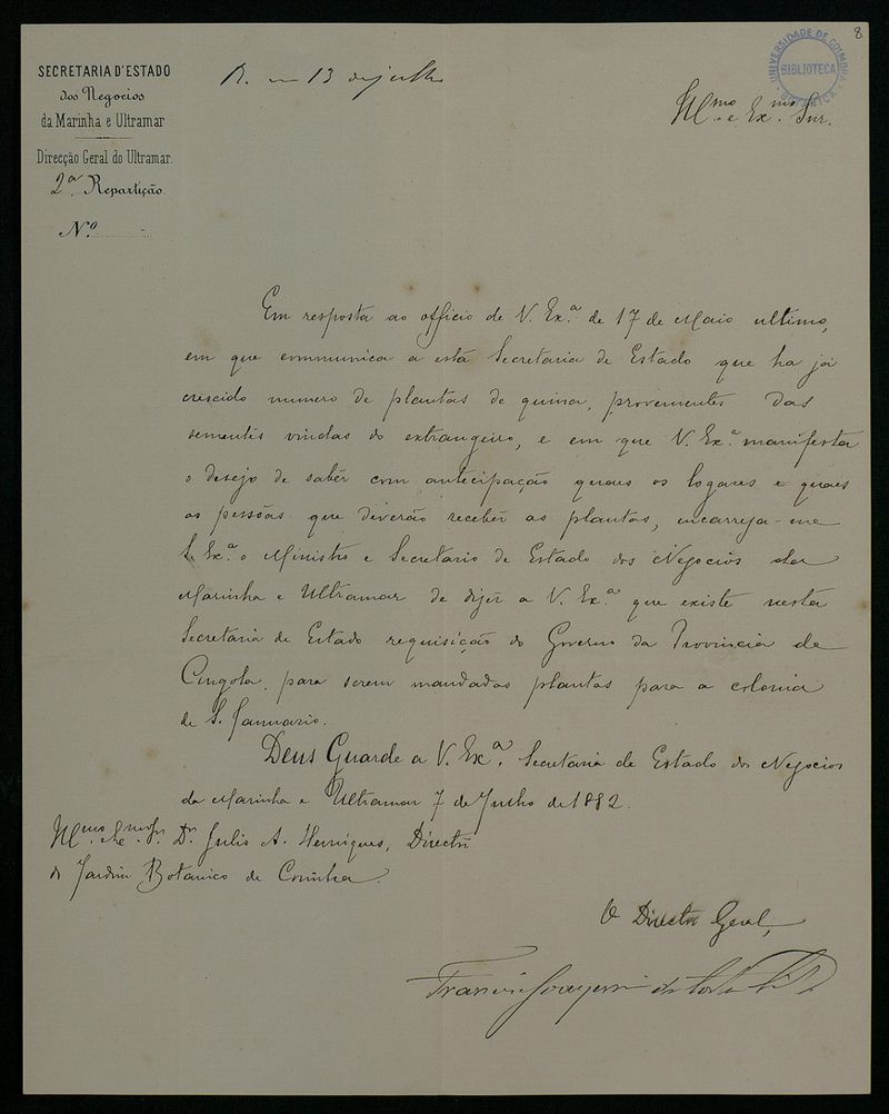 [Carta], 1882 Jul. 7, Lisboa, [a] Dr. Julio A. Henriques, Coimbra