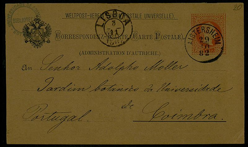 Correspondenz-Karte, 1882 Okt. 28, Aistersheim, an Senhor Adolpho Moller, Coimbra