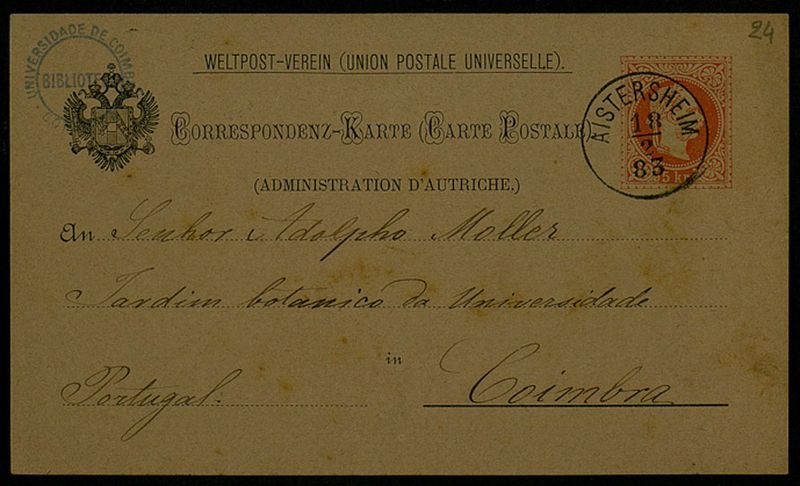 Correspondenz-Karte, 1883 Feb. 18, Aistersheim, an Senhor Adolpho Moller, Coimbra