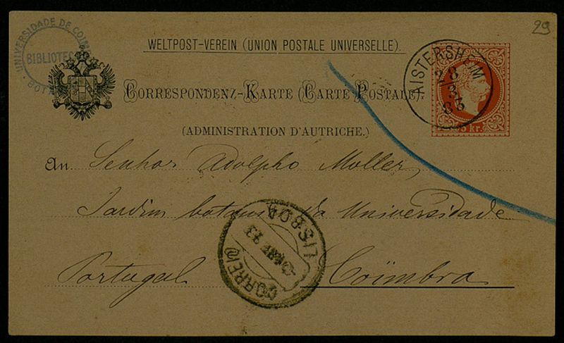 Correspondenz-Karte, 1883 März 28, Aistersheim, an Senhor Adolpho Moller, Coimbra