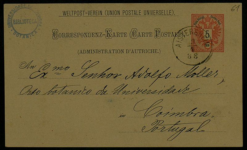 Correspondenz-Karte, 1888 Apr. 3, Aistersheim, an Exmo Senhor Adolpho Moller, Coimbra