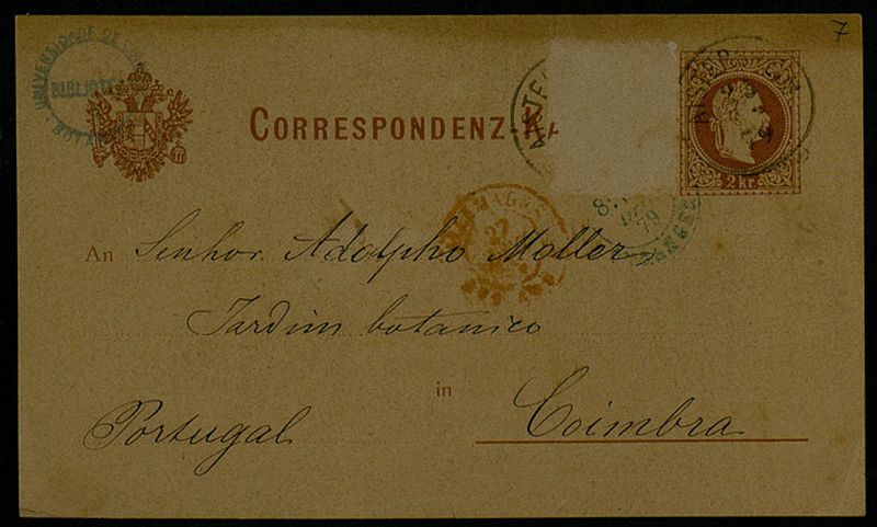 Correspondenz-K[arte], 1879 Dez. 25, Aistersheim, an Mr. A. Fr. Moller, Coimbra
