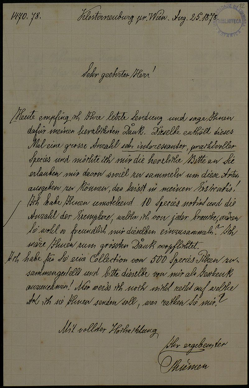 [Brief], 1878 Aug. 25, Klosterneuburg, [an] Herr[n Adolfo F. Möller, Coimbra]