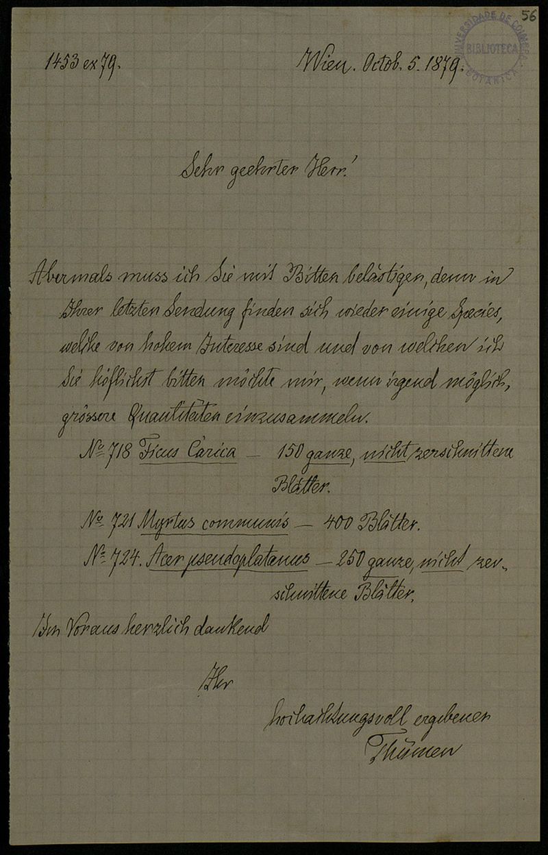 [Brief], 1879 Okt. 5, Wien, [an] Herr[n Adolfo F. Möller, Coimbra]